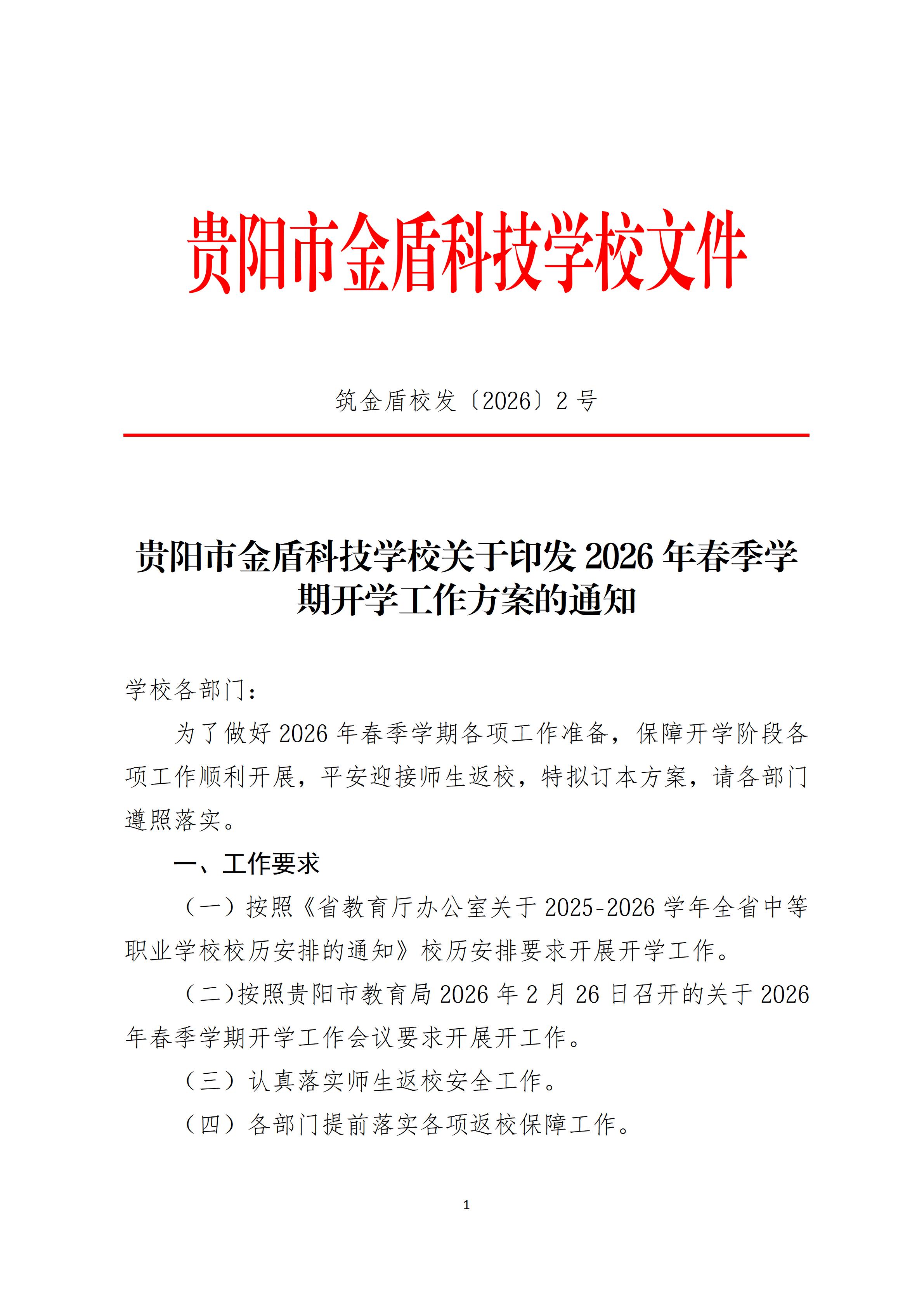 贵阳市金盾科技学校关于印发2026年春季学期开学工作方案的通知..