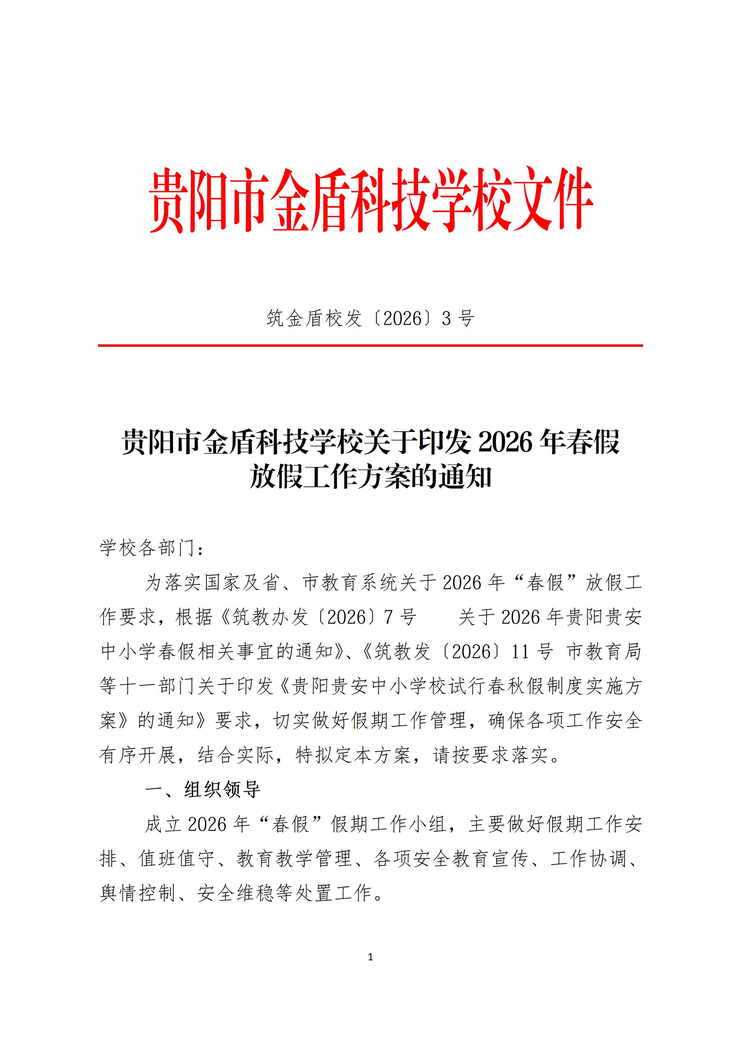 贵阳市金盾科技学校关于印发2026年春假 放假工作方案的通知